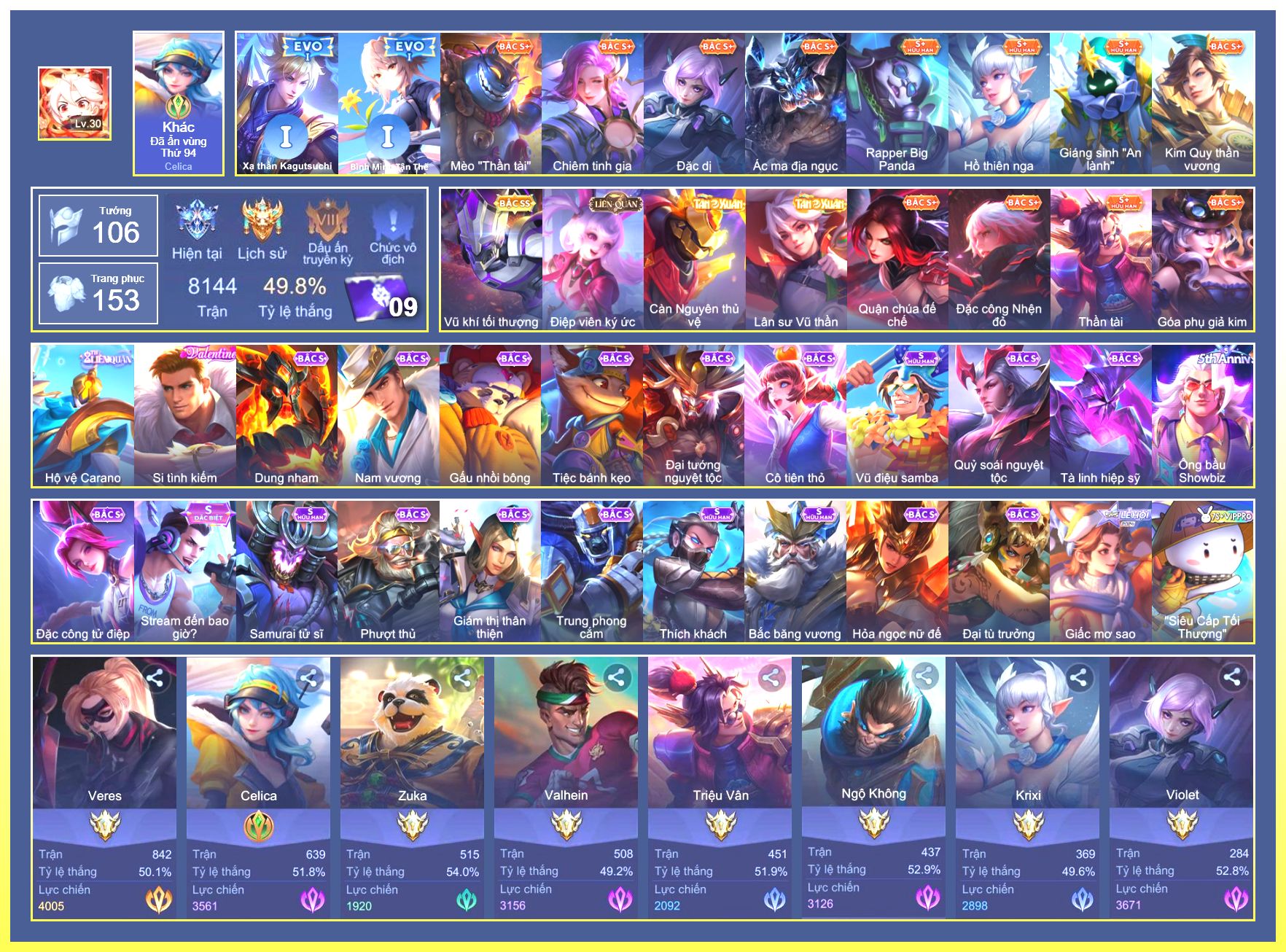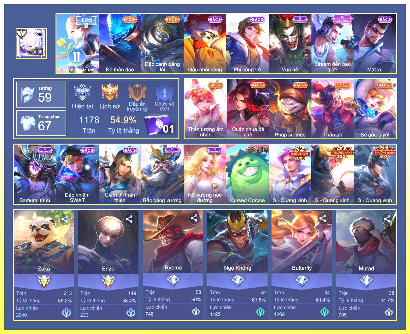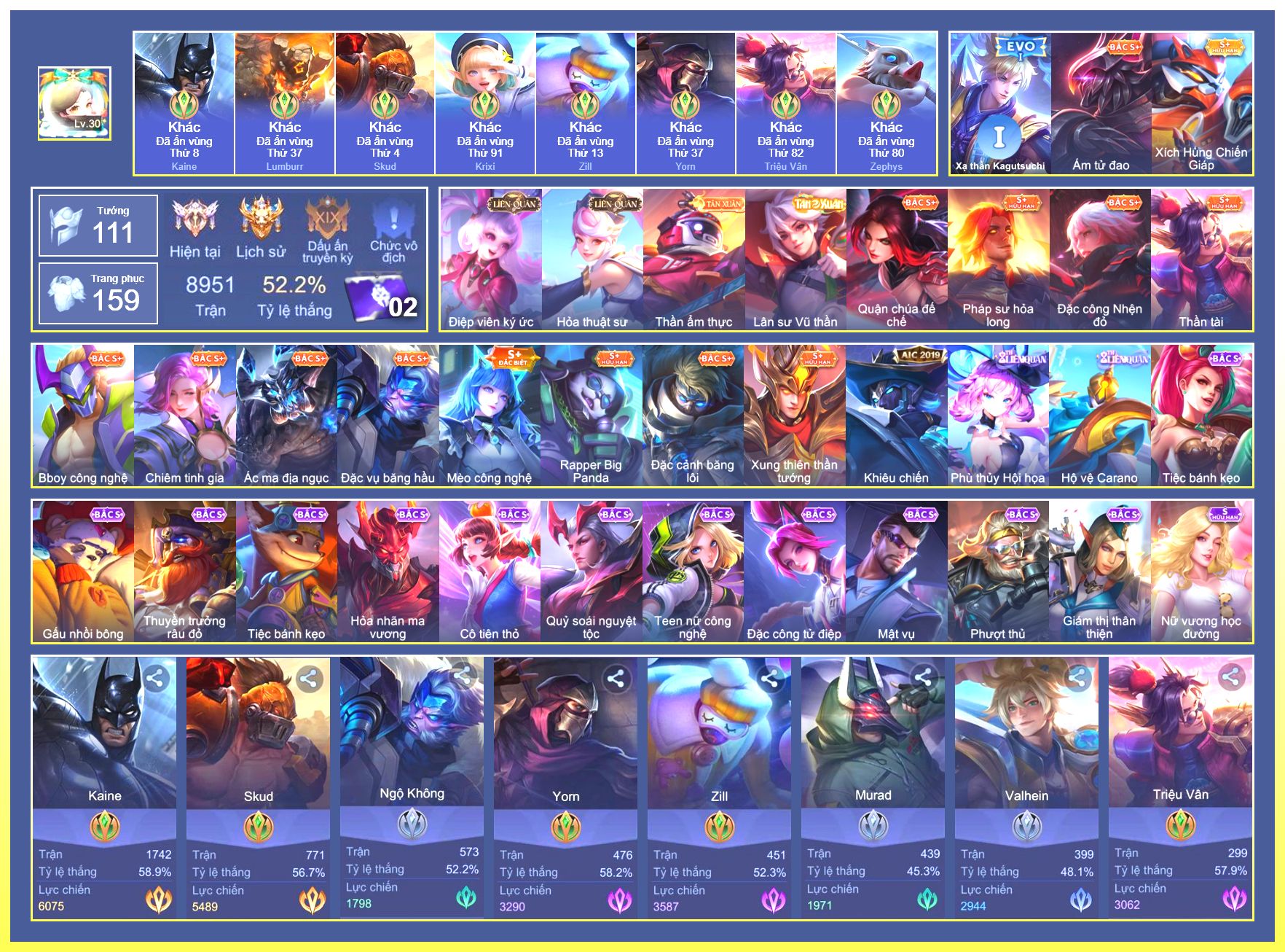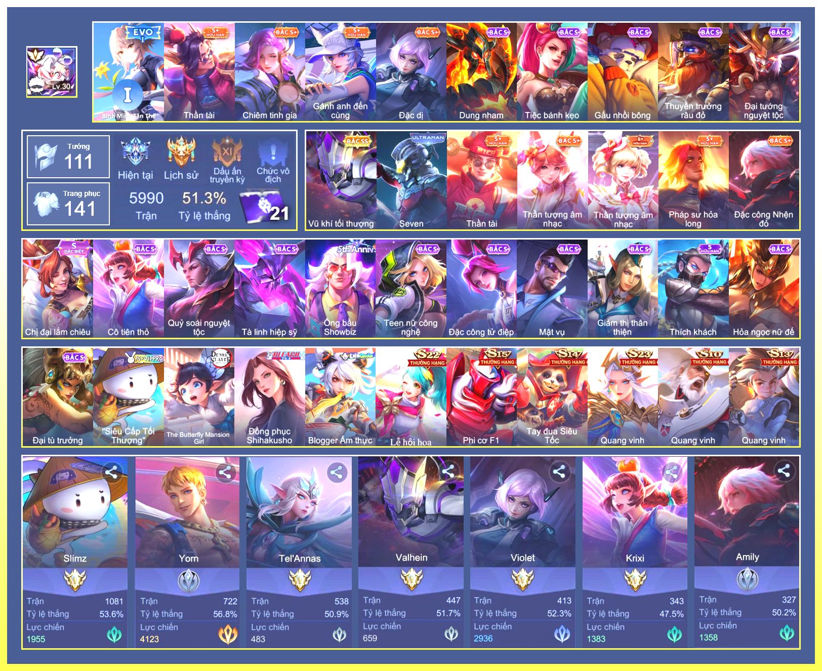 Nổi bật: Rất Nhiều Skin Đẹp VIP.Ngọc 90.Rất Nhiều Viên Ngọc 3.Yorn Thế Tử Nguyệt Tộc.Murad Siêu Việt.Nak Bboy Công Nghệ.Ryoma Ailing Samurai.Alice Bé Du Xuân.Violet Đặc Dị...