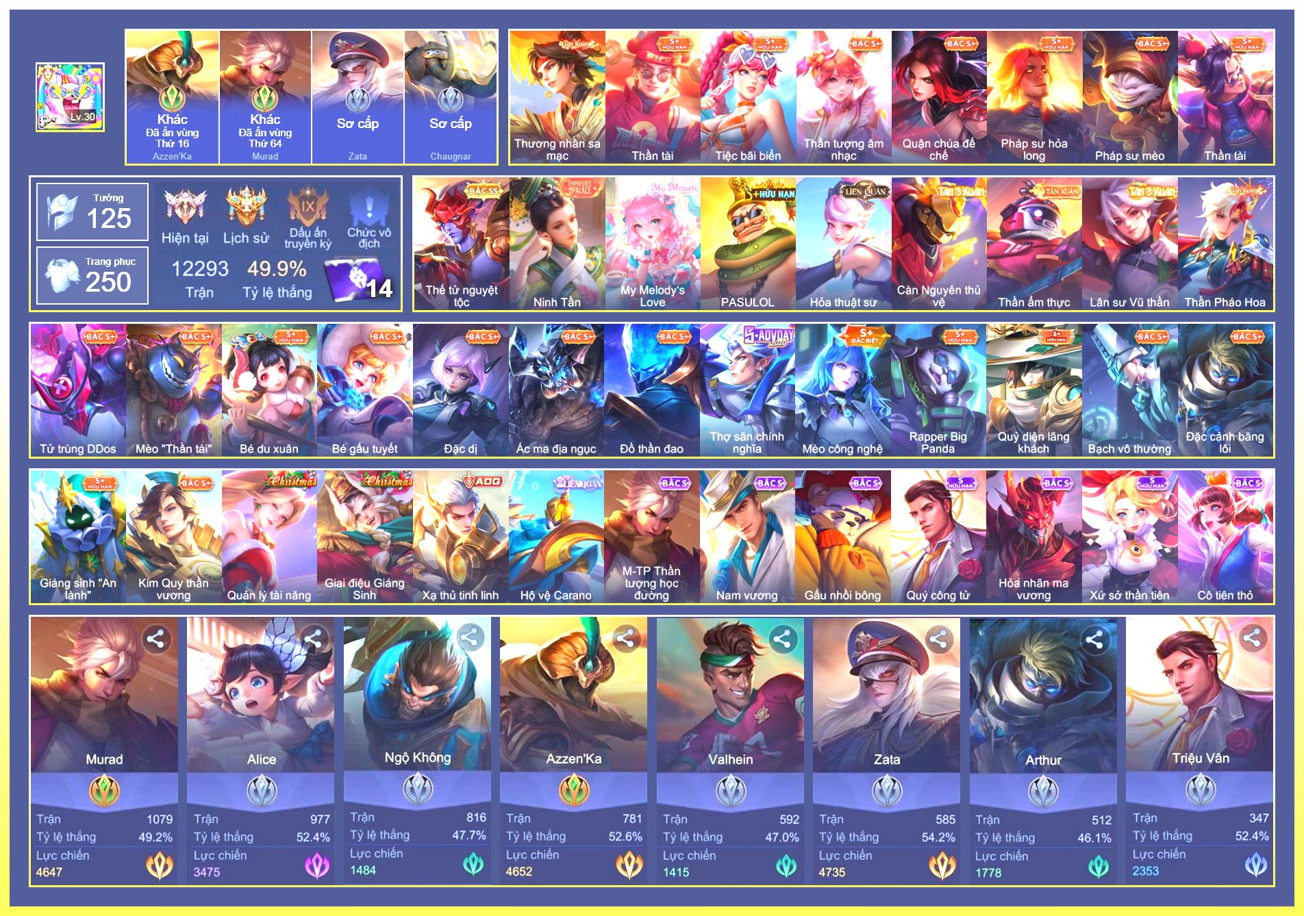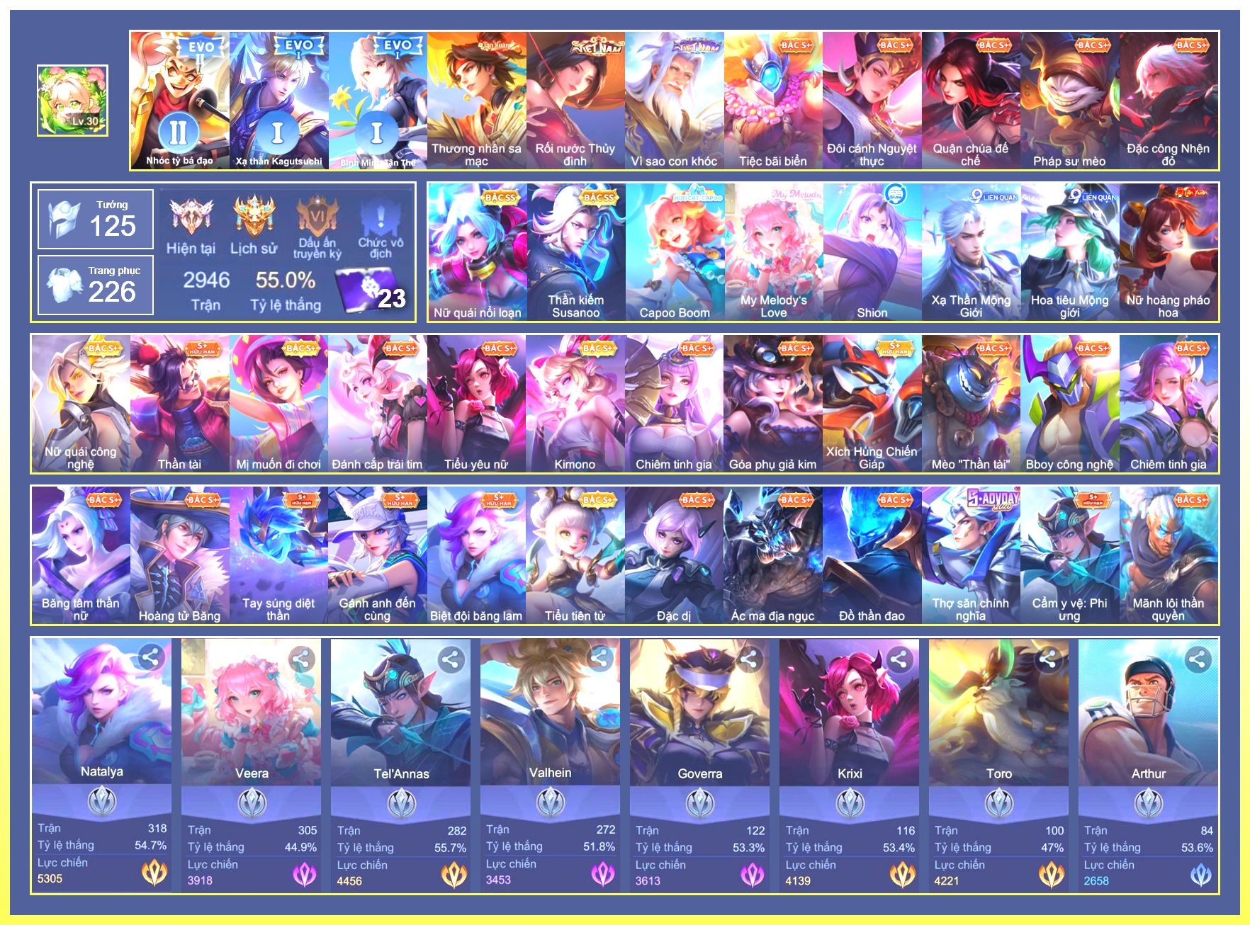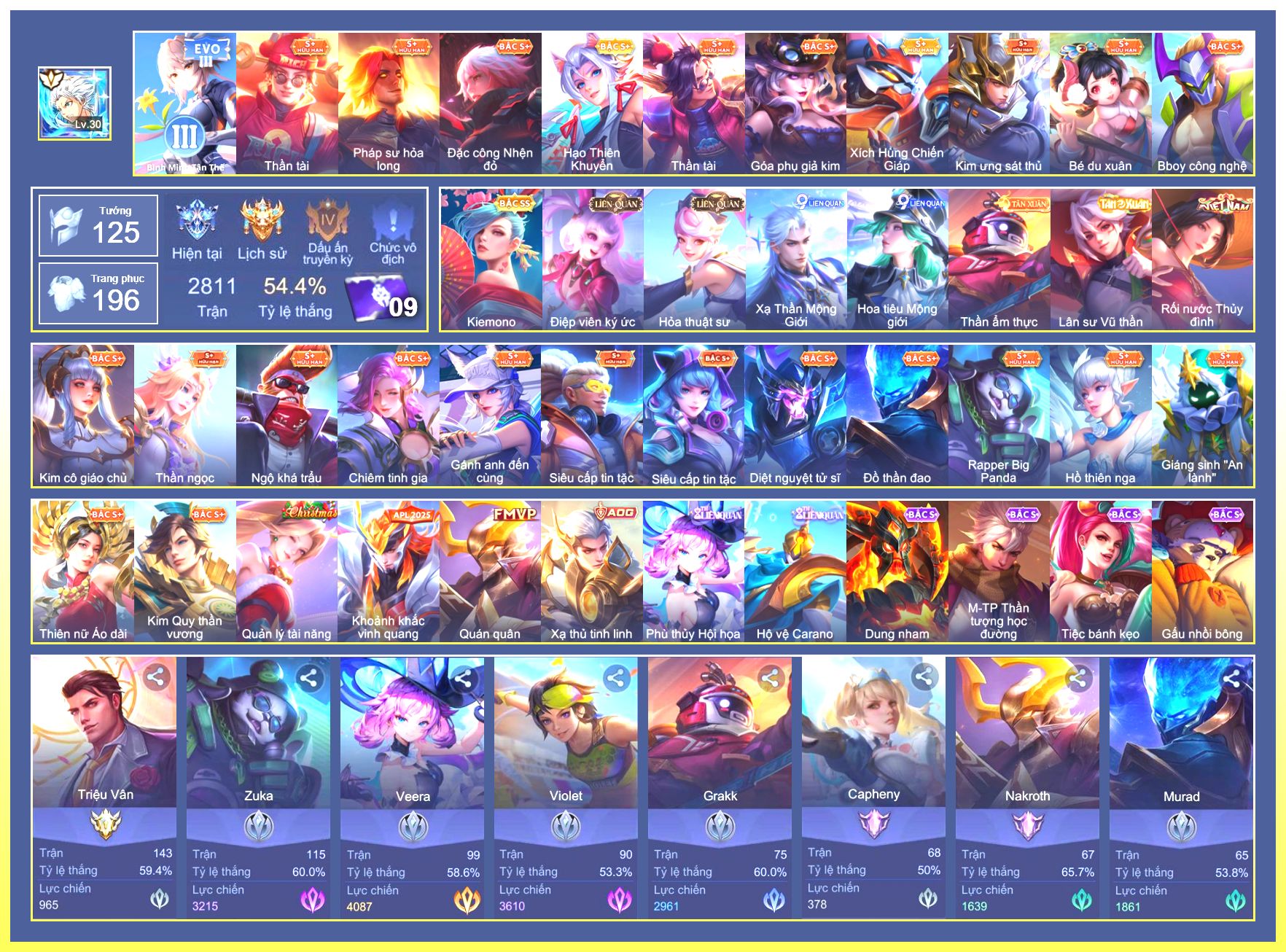 Nổi bật: Rất Nhiều Skin Đẹp VIP.Ngọc 90.Rất Nhiều Viên Ngọc 3.Lữ Bố Tư Lệnh Robot.Murad Siêu Việt.Taara Tiệc Bãi Biển.Điêu Thuyền Tà Linh Pháp Trượng.Ryoma Chiến Binh Cyborg.Ryoma Thăng Long Bang Chủ.Nak Bboy Công Nghệ...
