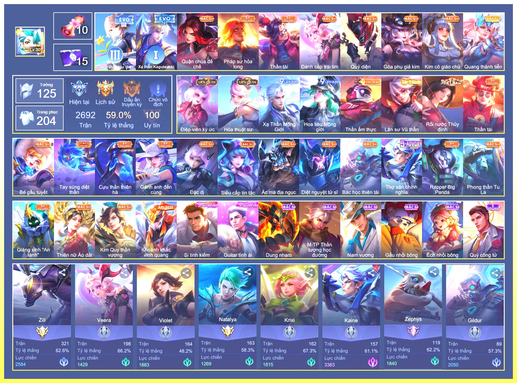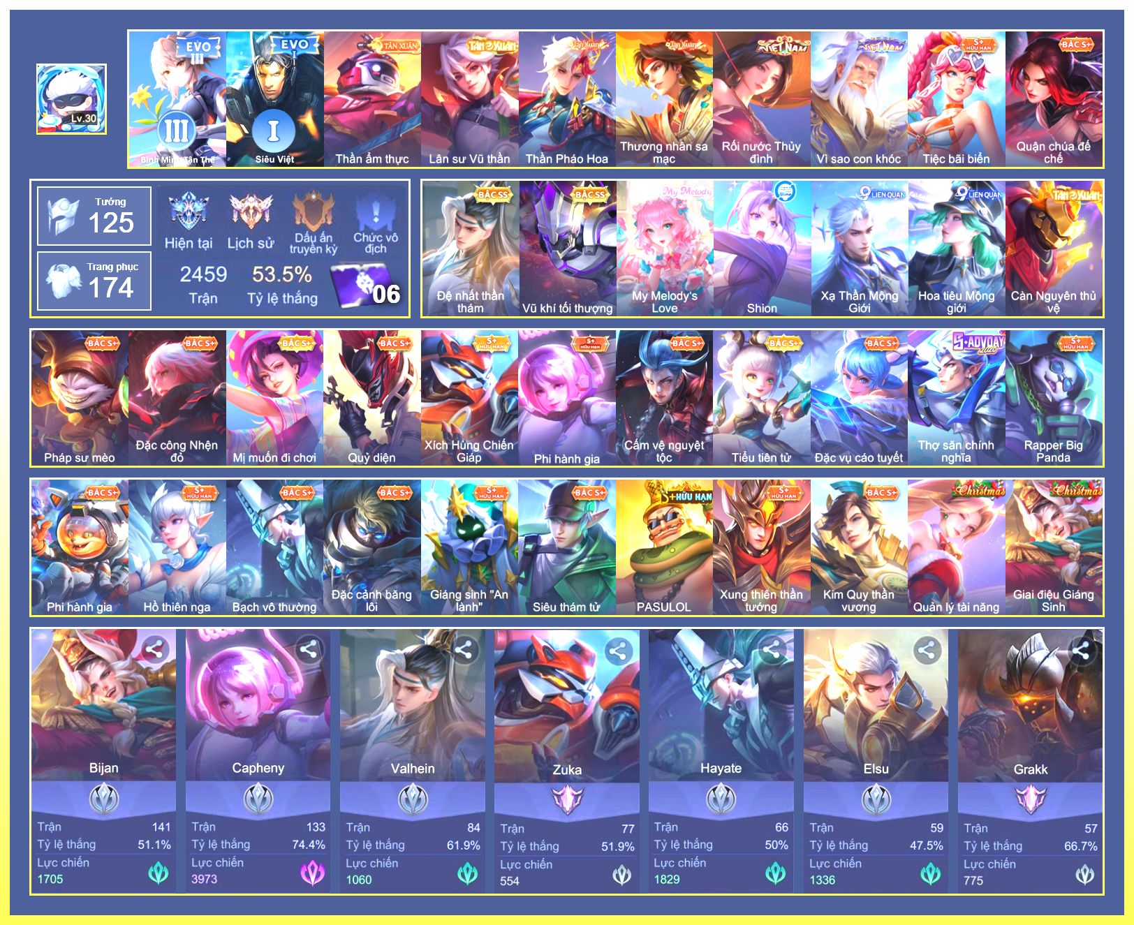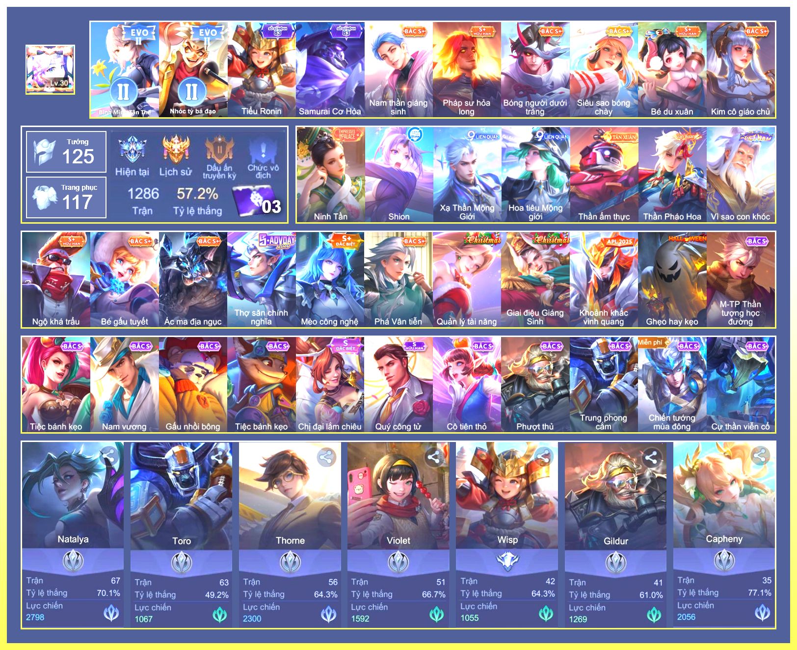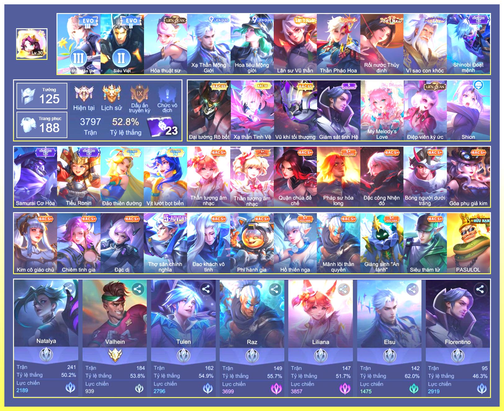 Nổi bật: Rất Nhiều Skin Đẹp VIP.Ngọc 90.Rất Nhiều Viên Ngọc 3.Lữ Bố Tư Lệnh Robot.Murad Siêu Việt.Taara Tiệc Bãi Biển.Điêu Thuyền Tà Linh Pháp Trượng.Ryoma Chiến Binh Cyborg.Ryoma Thăng Long Bang Chủ.Nak Bboy Công Nghệ...