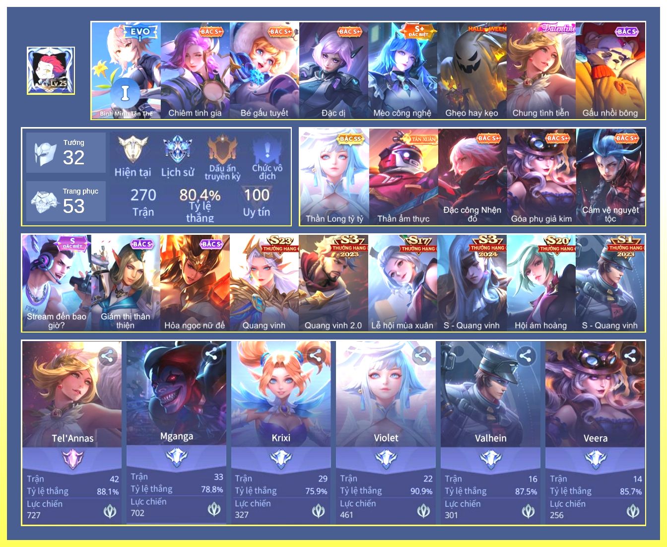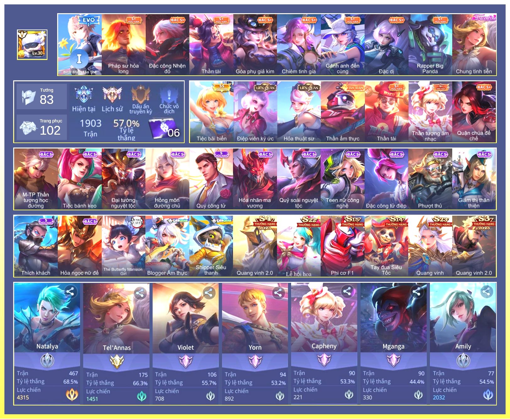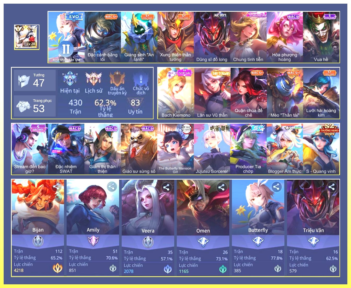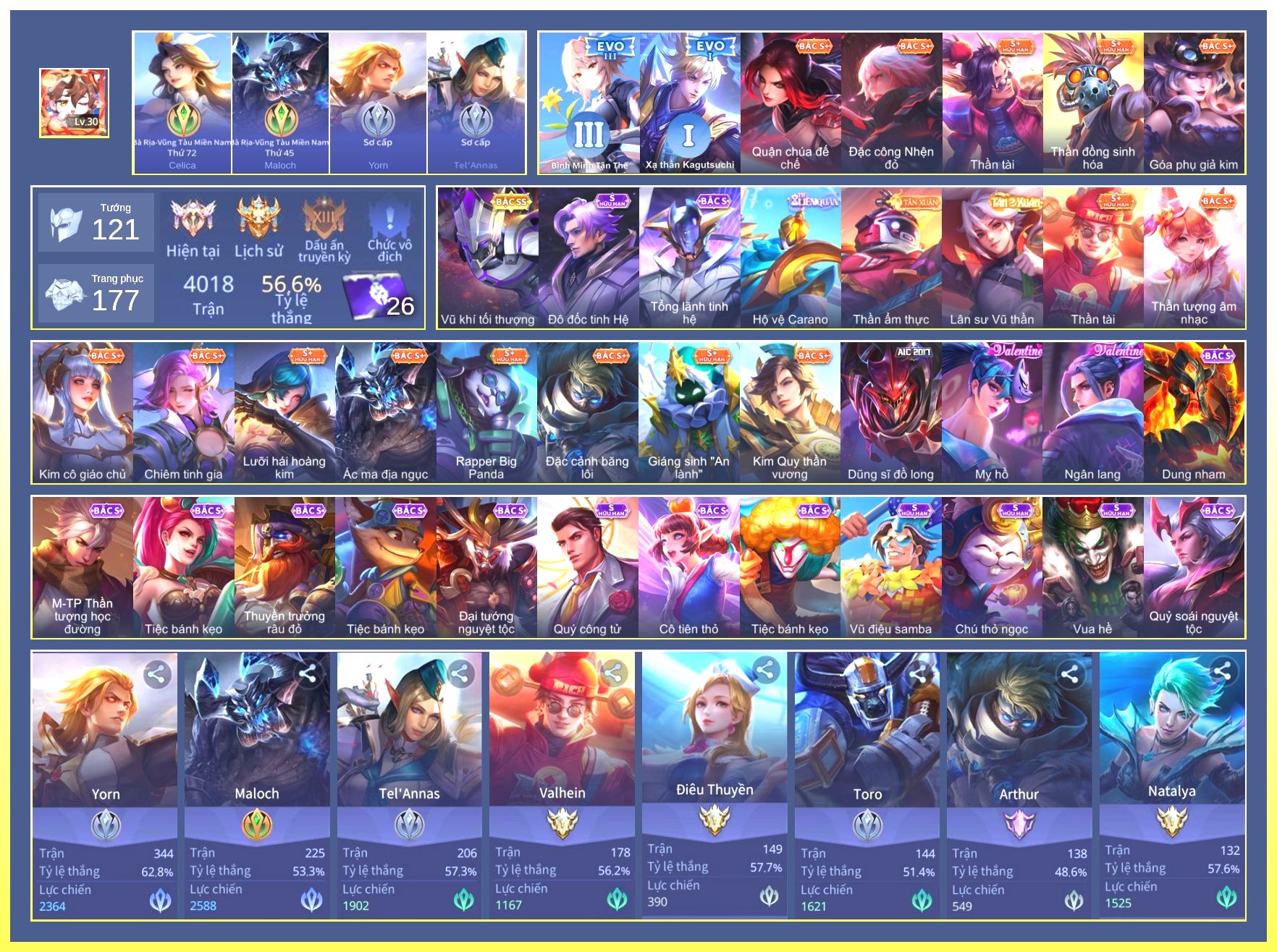 Nổi bật: Rất Nhiều Skin Đẹp Vip.Ngọc 90.Dư 4 Đá Quý.Omen Đao Phủ Tận Thế.Butterfly Nữ Quái Nổi Loạn.Valhein Xạ Thần.Nak Siêu Việt.Butterfly Bình Minh Tận Thế.Ngộ Không Nhóc Tỳ Bá Đạo.Quillen Người Gác Đền.Thorne Giả Kim Thuật Sư.Nak Bboy Công Nghệ...