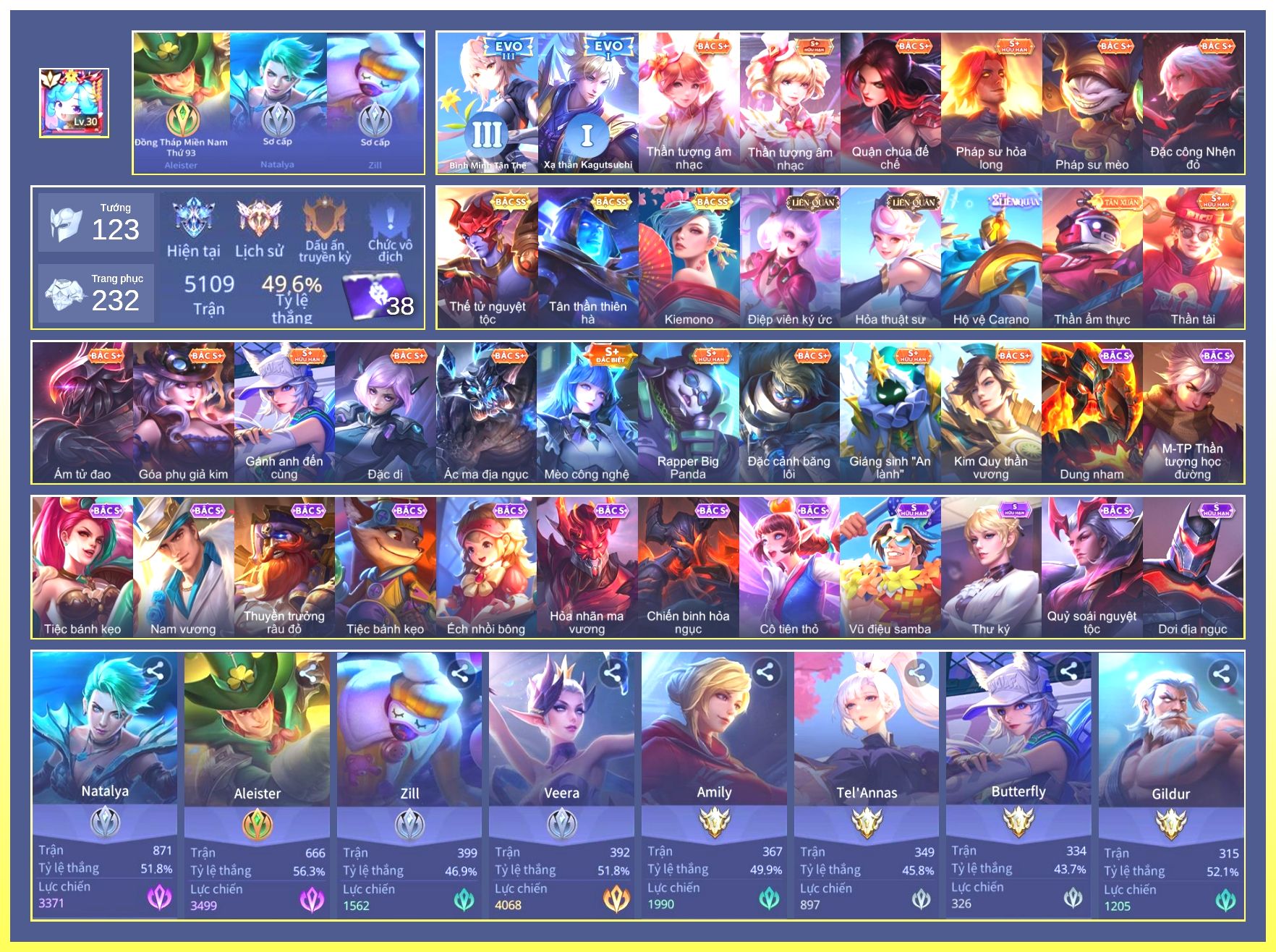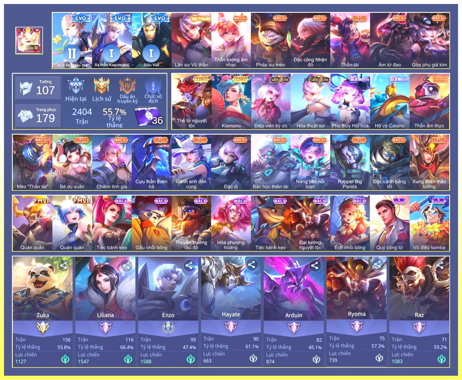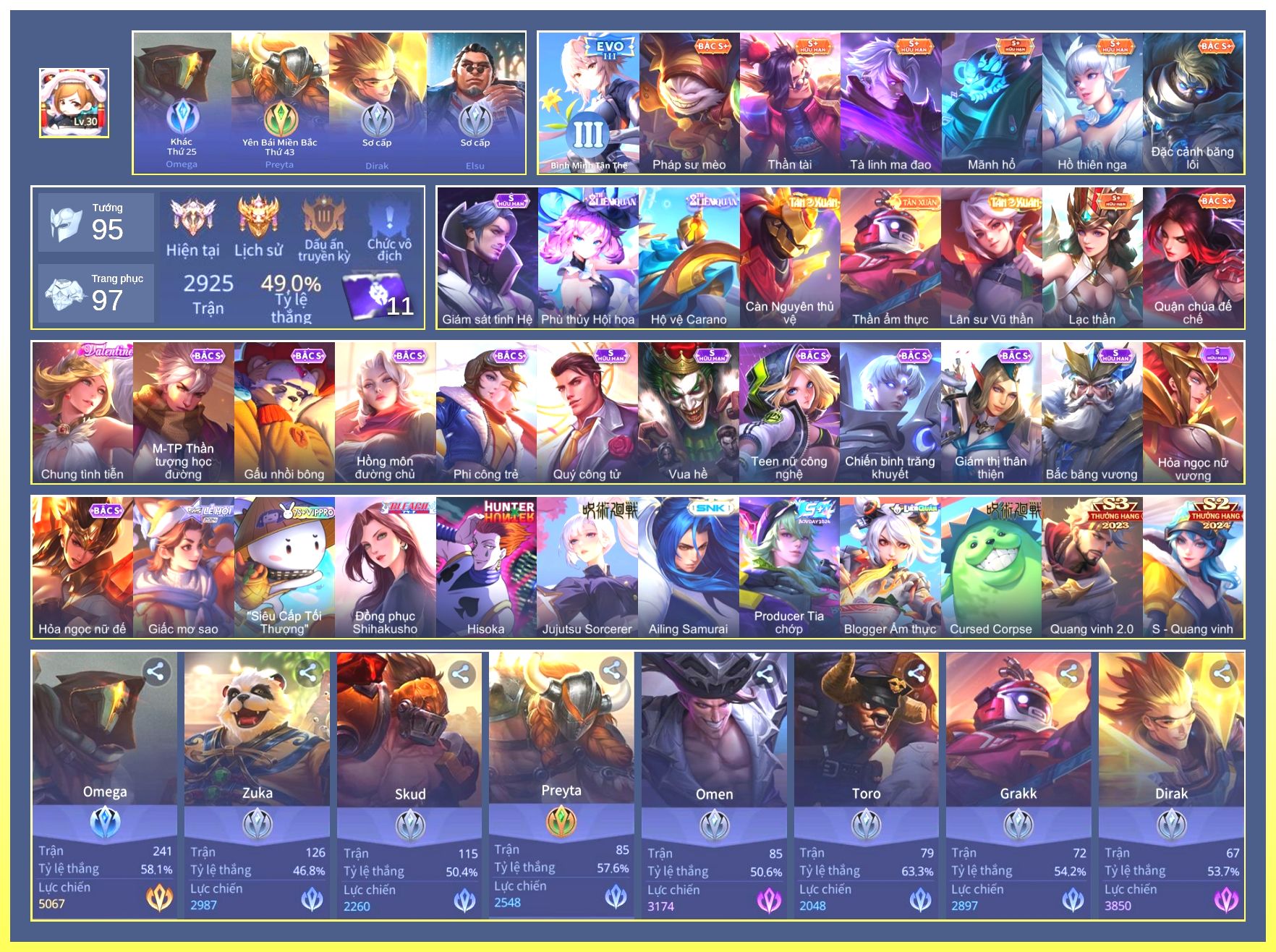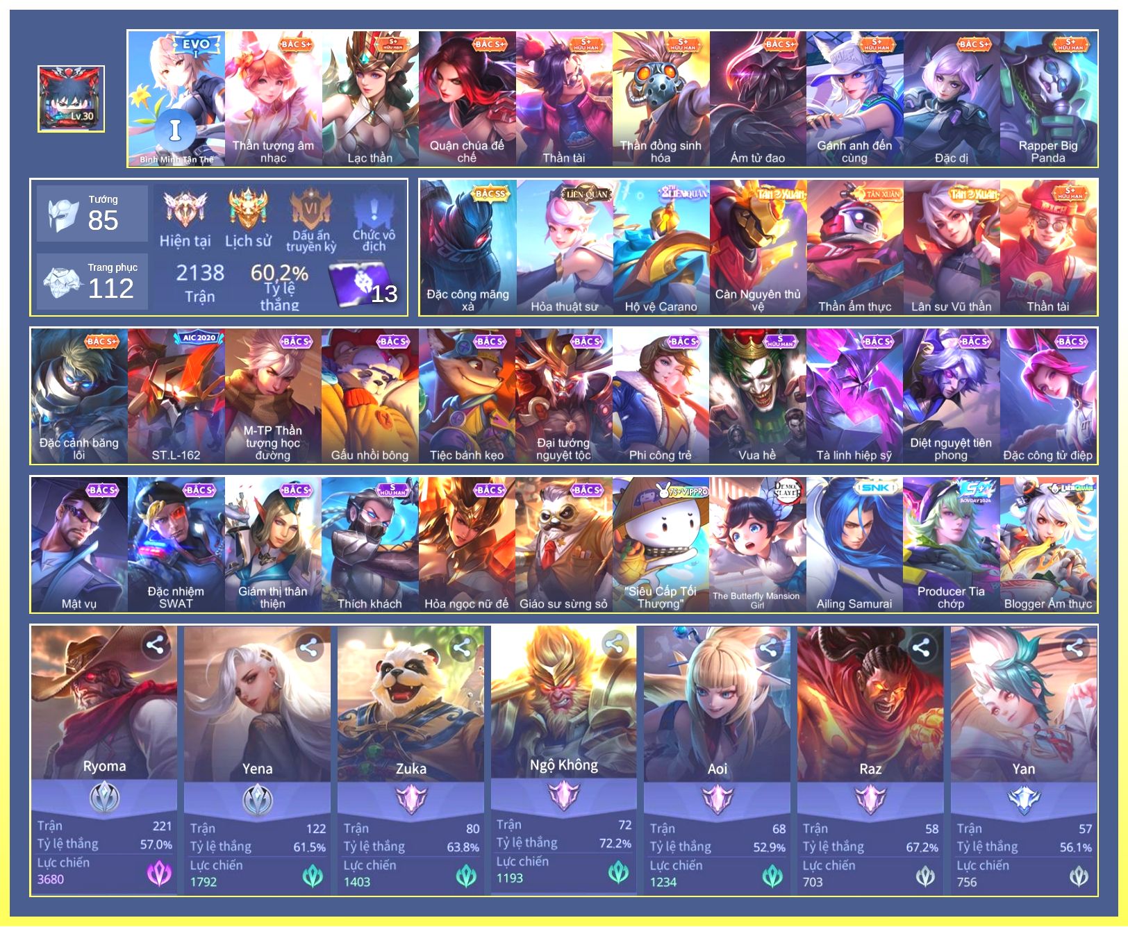 Nổi bật: Rất Nhiều Skin Đẹp Vip.Ngọc 90.Dư 4 Đá Quý.Omen Đao Phủ Tận Thế.Butterfly Nữ Quái Nổi Loạn.Valhein Xạ Thần.Nak Siêu Việt.Butterfly Bình Minh Tận Thế.Ngộ Không Nhóc Tỳ Bá Đạo.Quillen Người Gác Đền.Thorne Giả Kim Thuật Sư.Nak Bboy Công Nghệ...