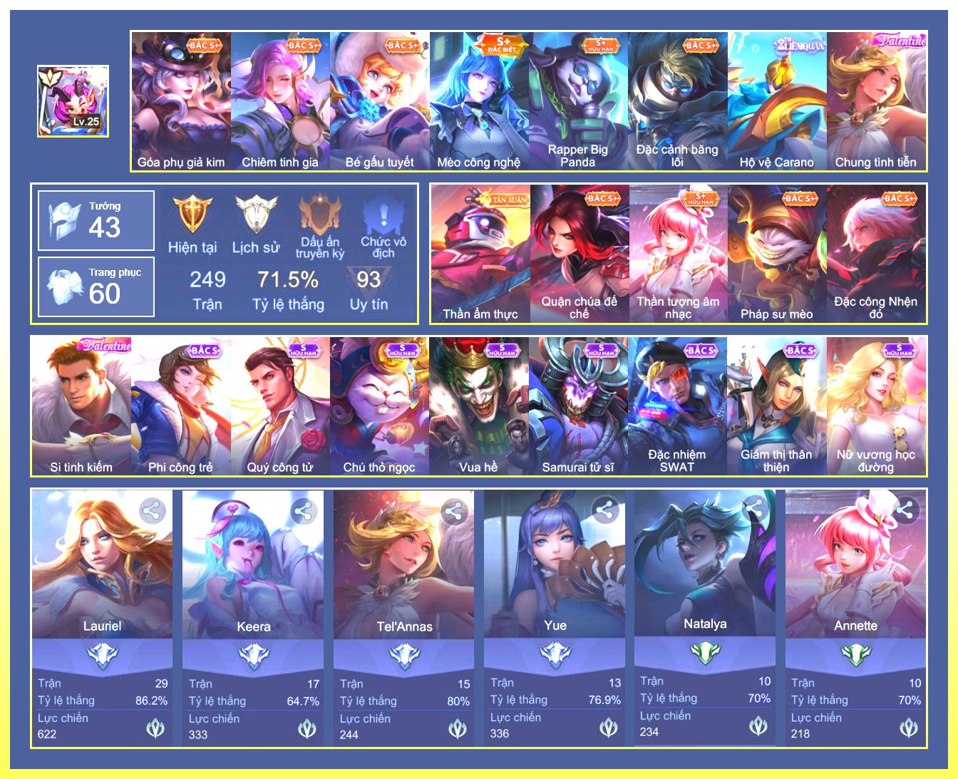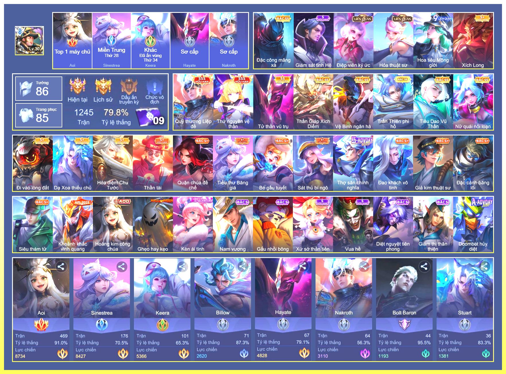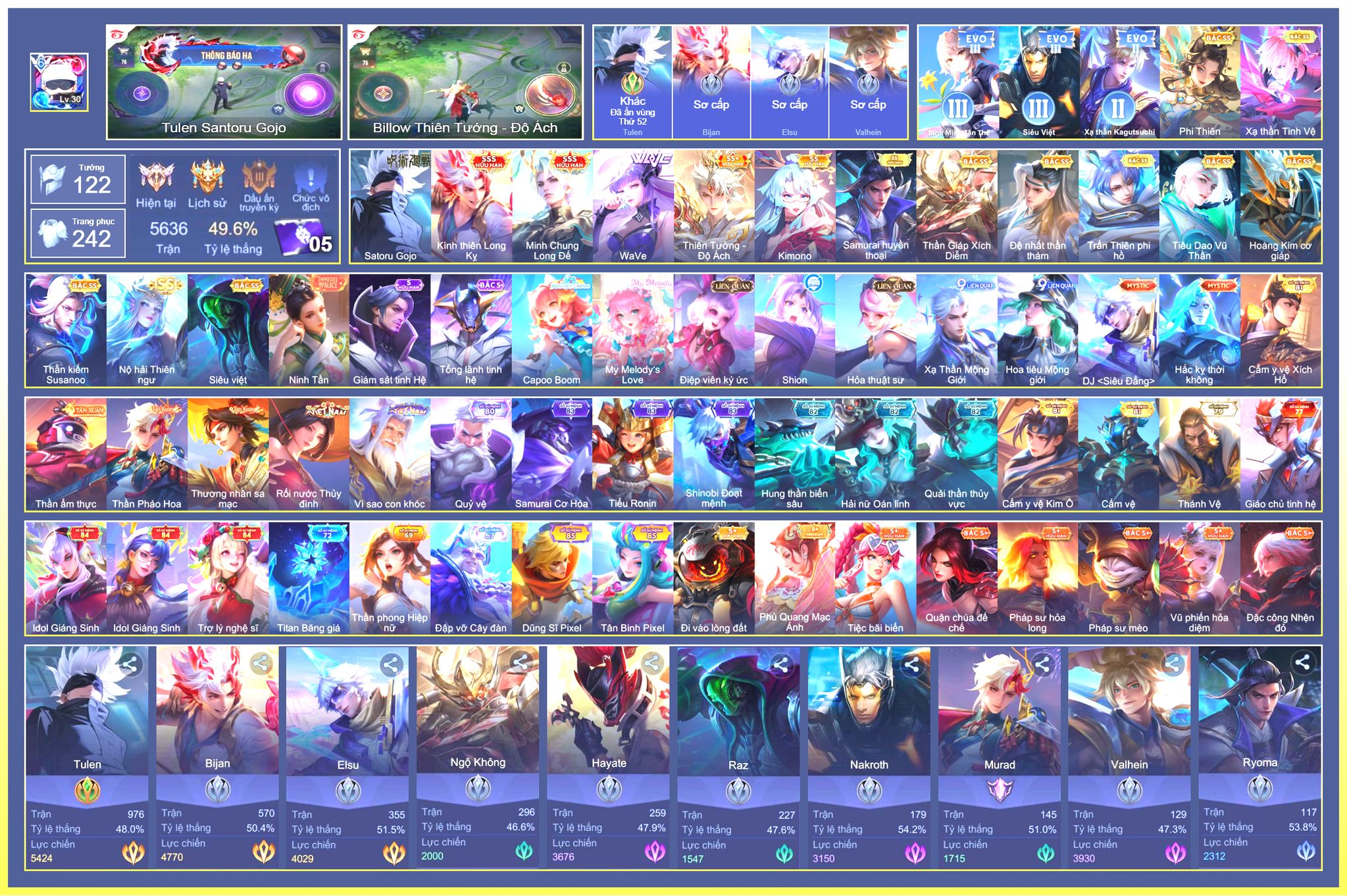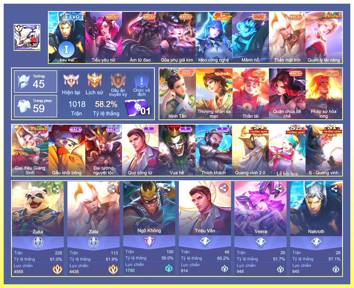 Nổi bật: Rất Nhiều Skin Đẹp Vip.Ngọc 90.Dư 343K Vàng.Dư 1 Đá Quý.Slimz Siêu Cấp Tối Thượng.Nak Producer Tia Chớp.Roxie Kèn Tình Ái.Zuka Gấu Nhồi Bông....