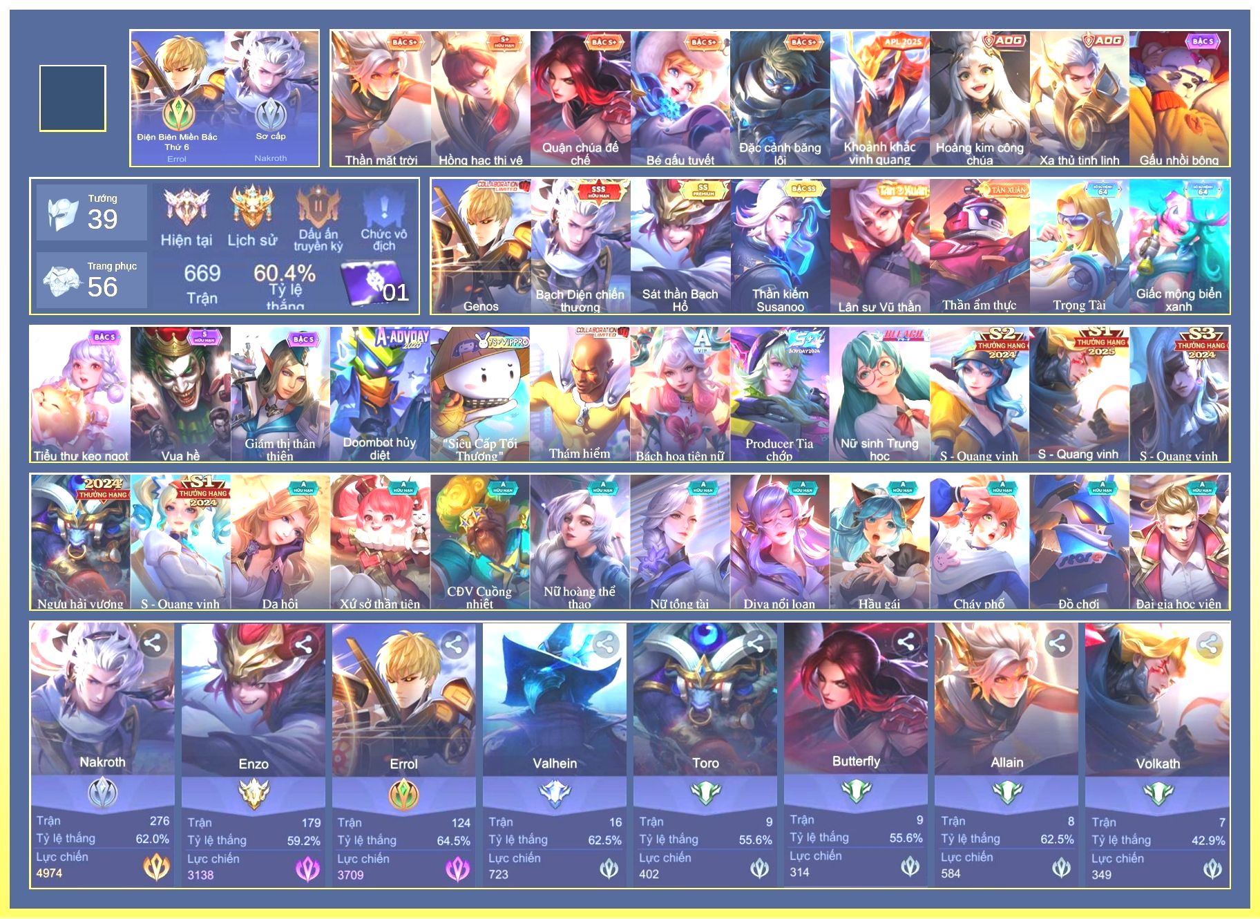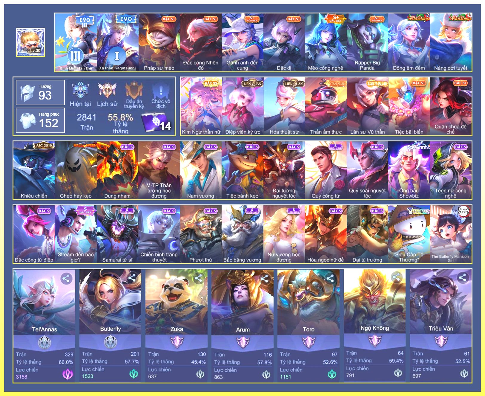 Nổi bật: Rất Nhiều Skin Đẹp Vip.Ngọc 90.Dư 1 Đá Quý.Slimz Siêu Cấp Tối Thượng.Butterfly Bình Minh Tận Thế.Quillen Giám Đốc Âm Nhạc.Krixi Hồ Thiên Nga.Omen Ám Tử Đao....