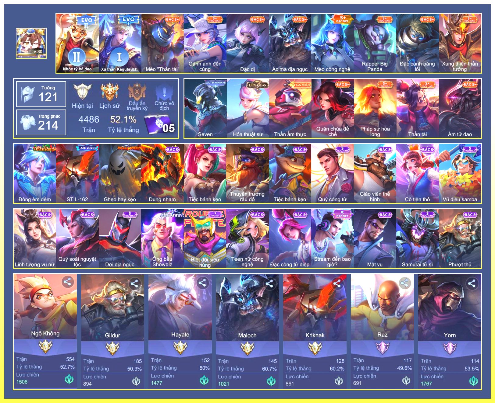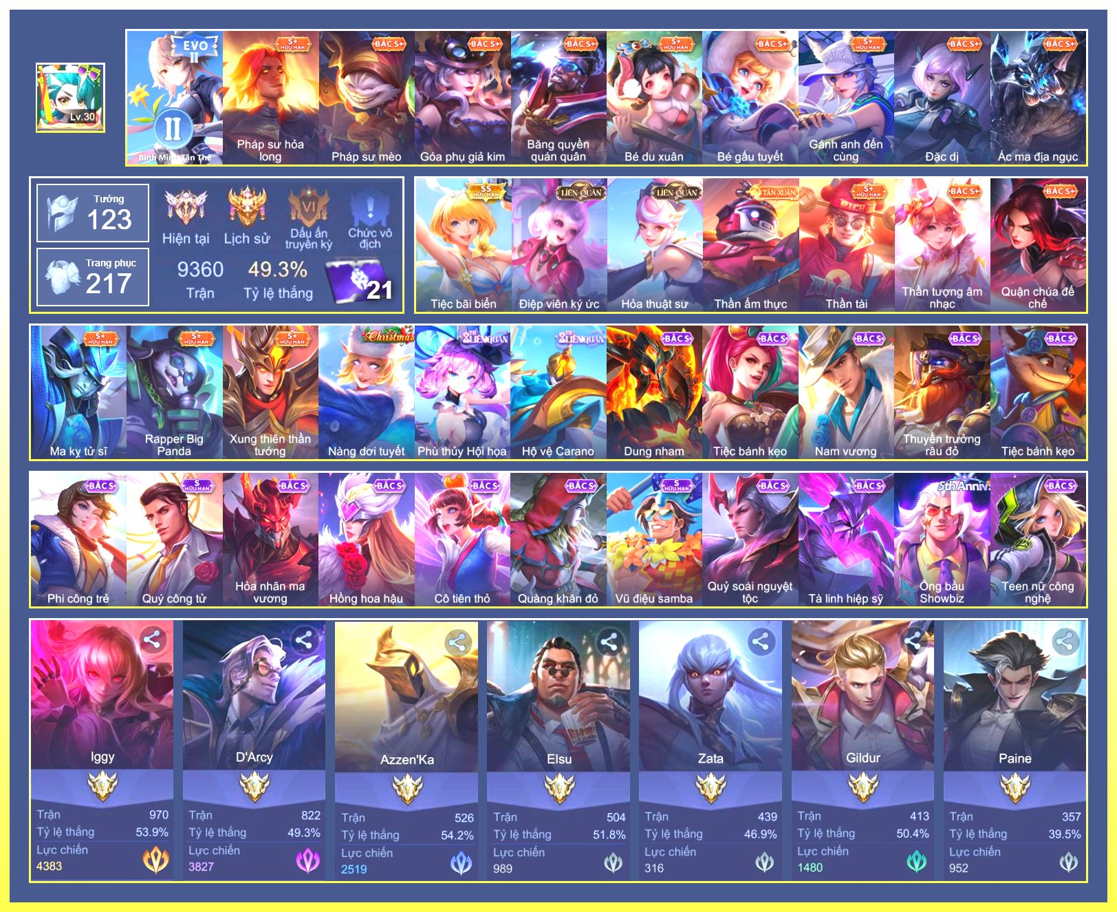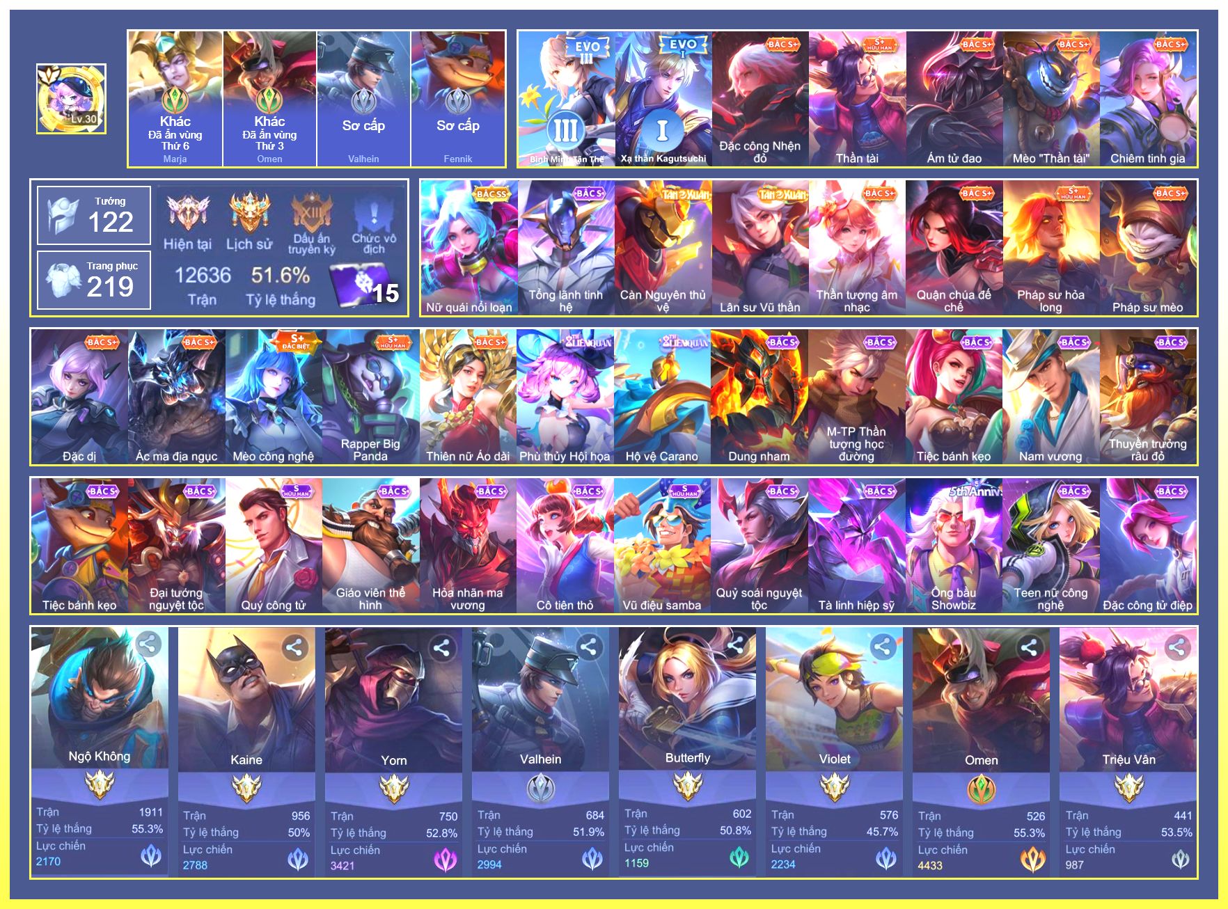 Nổi bật: Rất Nhiều Skin Đẹp Vip.Ngọc 90.Violet Tiệc Bãi Biển.Liliana Nguyệt Mị Ly.Valhein Xạ Thần.Yorn Soái Ca Học Đường.Zephys Inosuke Hashibira....