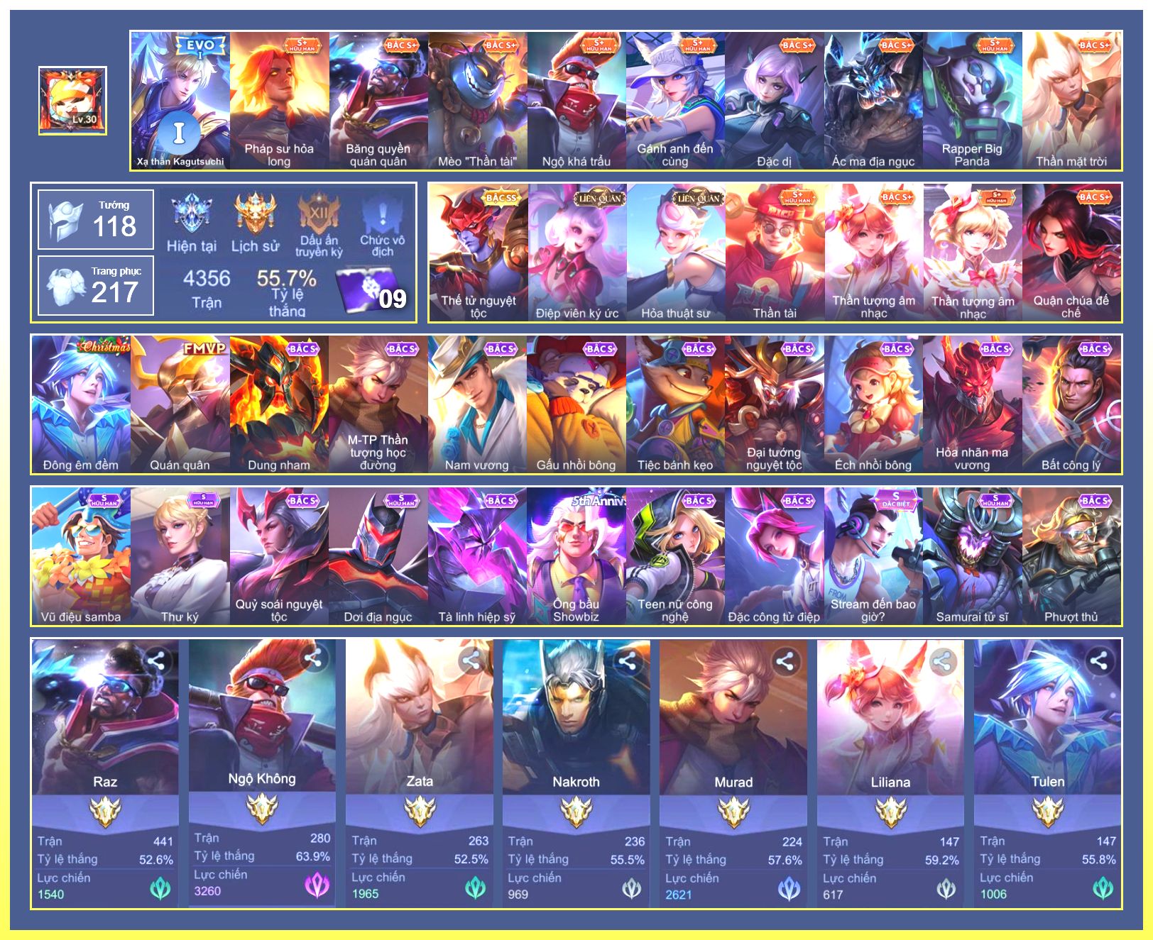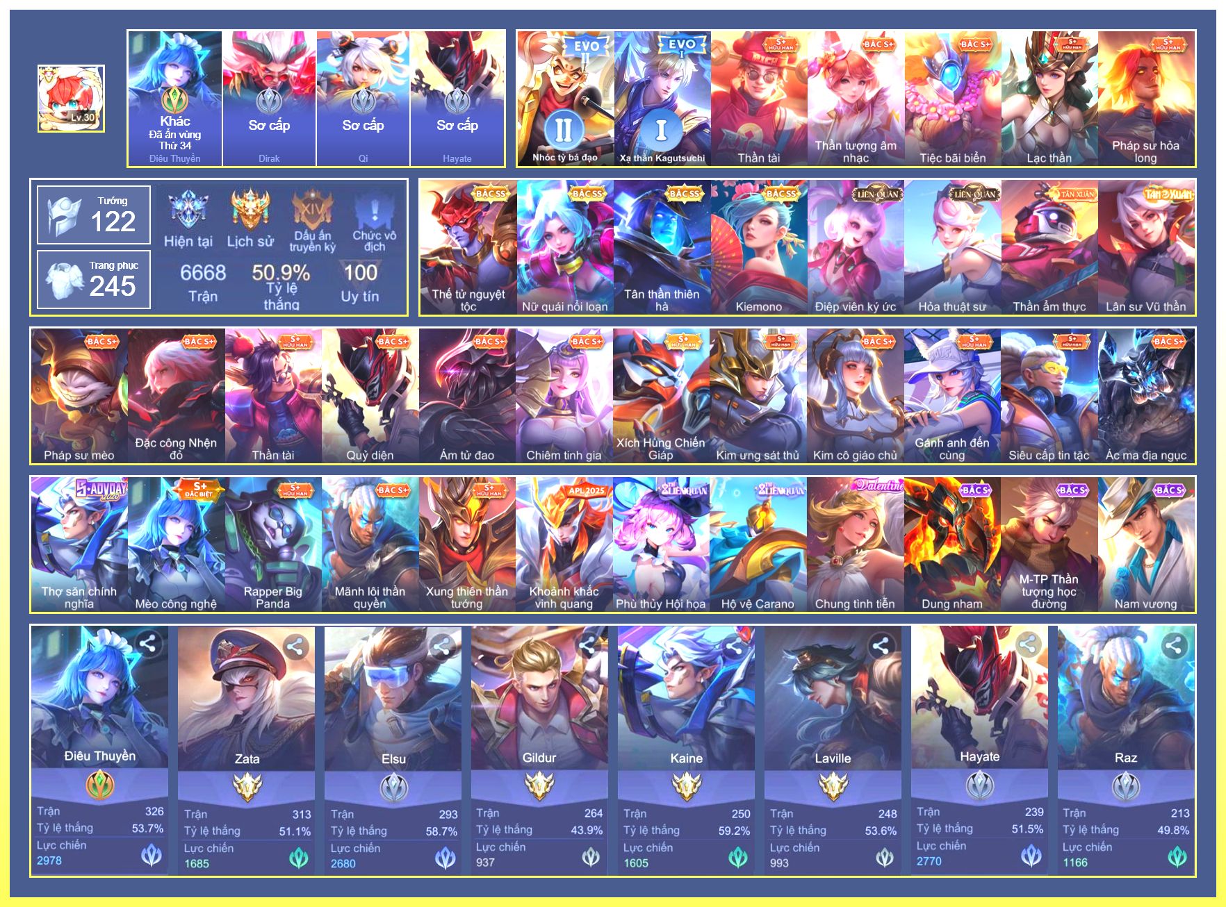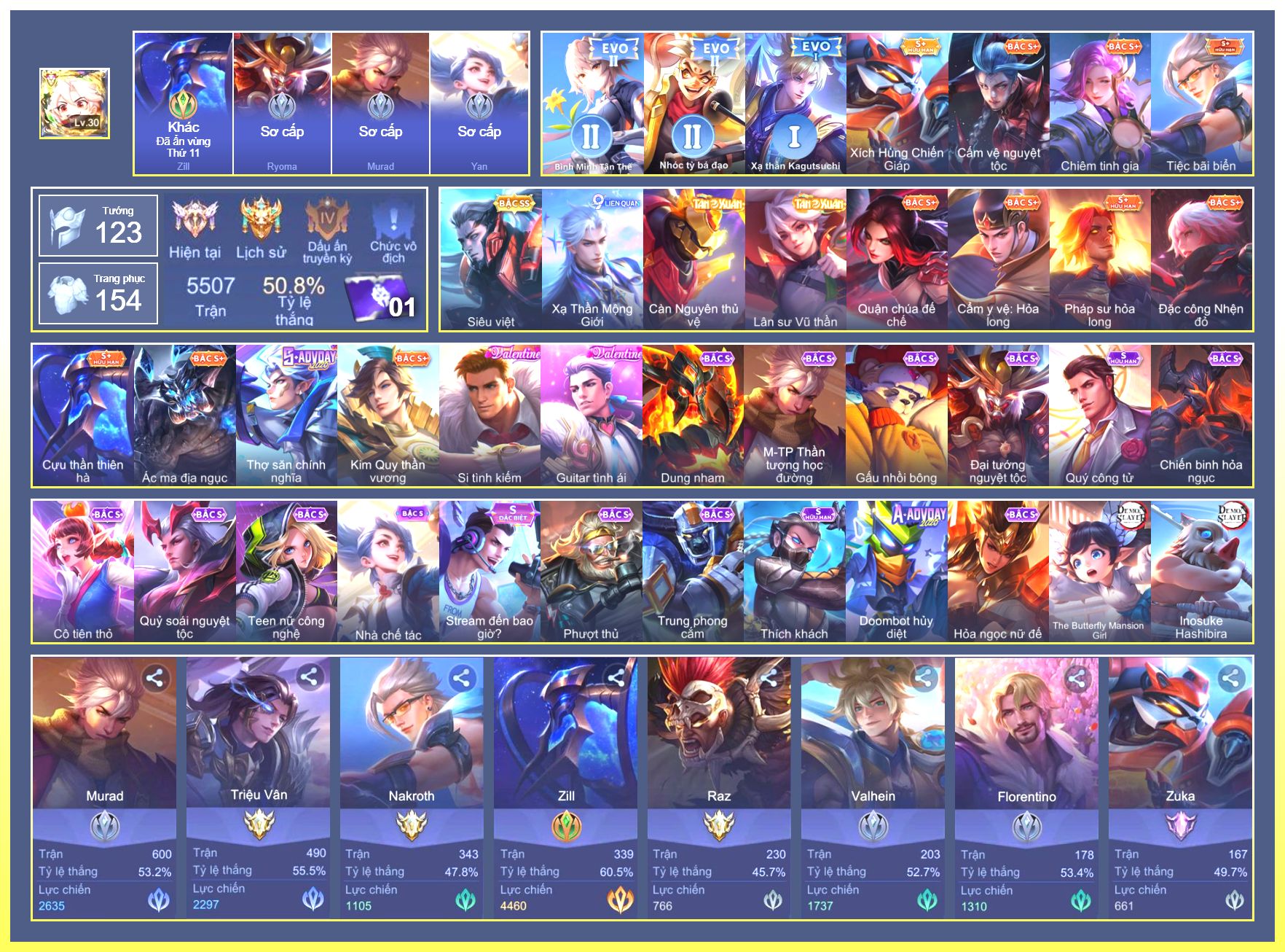Nổi bật: Rất Nhiều Skin Đẹp Vip.Ngọc 90.Dư 3 Đá Quý.Yorn Thế Tử Nguyệt Tộc.Nak Siêu Việt.Butterfly Bình Minh Tận Thế.Natalya Băng Tâm Thần Nữ.Butterfly Đông Êm Đềm...